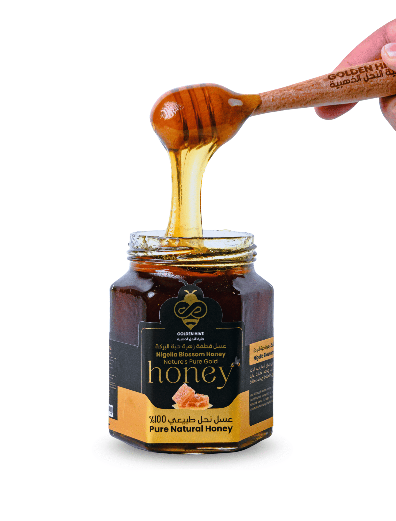 Pure natural honey harvested from black seed blossoms, known for supporting immunity and overall well-being.